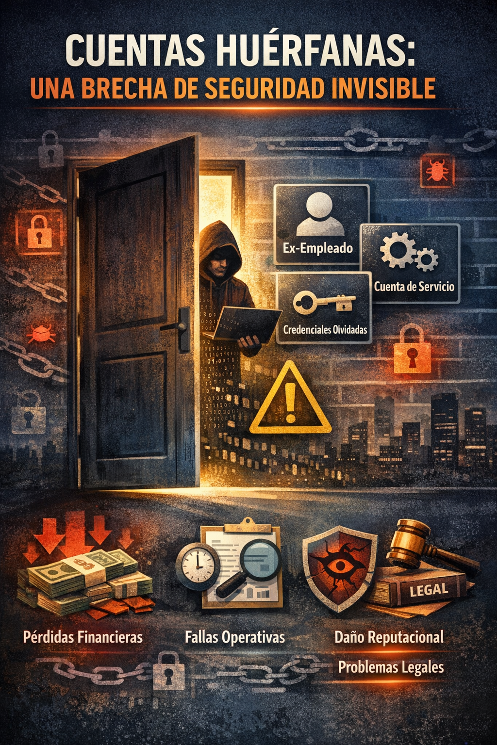 - Operacional: Las cuentas huérfanas aumentan la complejidad de auditar usuarios y generan ineficiencias operativas. Si no sabemos quién tiene acceso a qué, el tiempo de gestión aumentará, afectando la productividad.